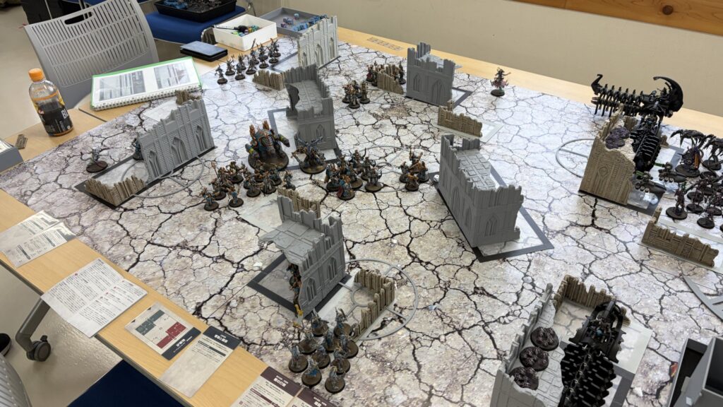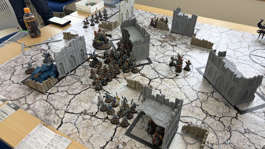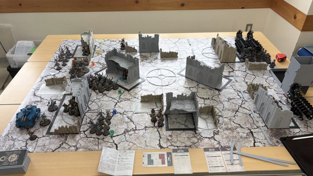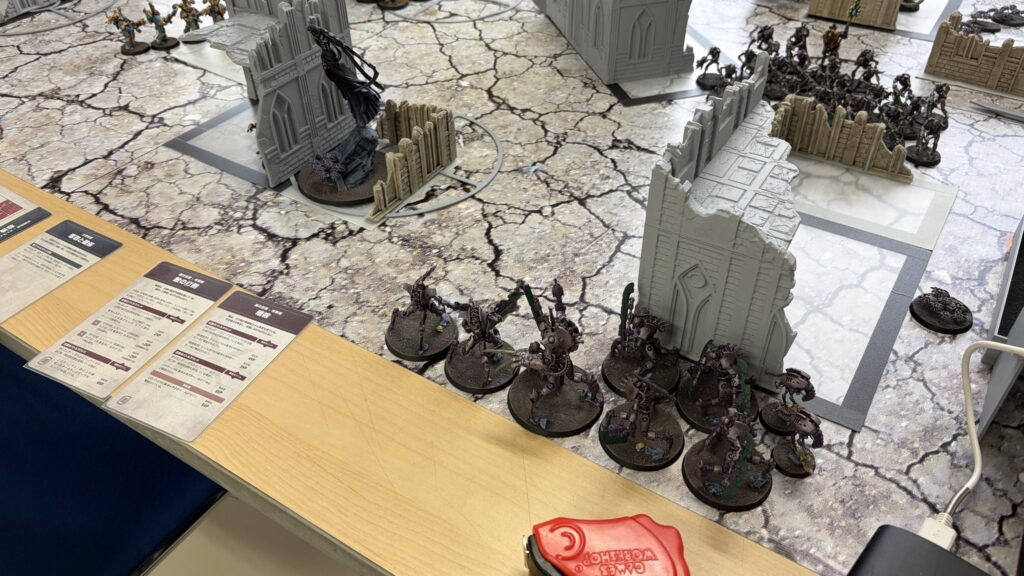 私はナイトブリンガーとスコーペクデストロイヤー縦深させ、yutaさんはエンライテンド2ユニットを縦深させつつ、ロボと強化で浸透を付与したルブリックマリーン2ユニットを浸透配置させます。