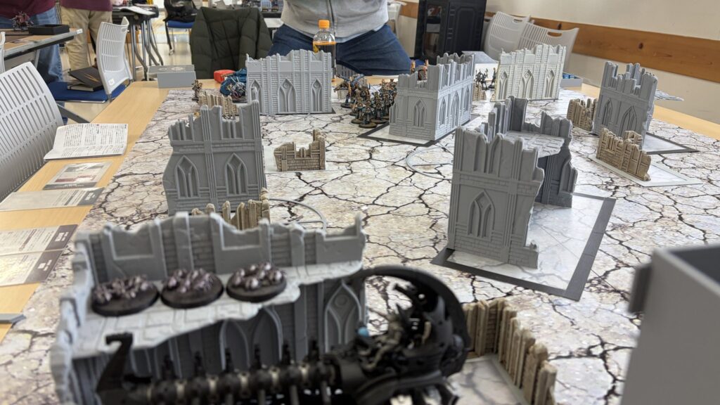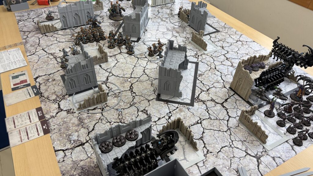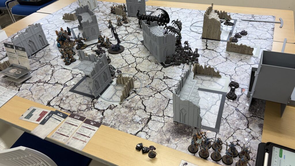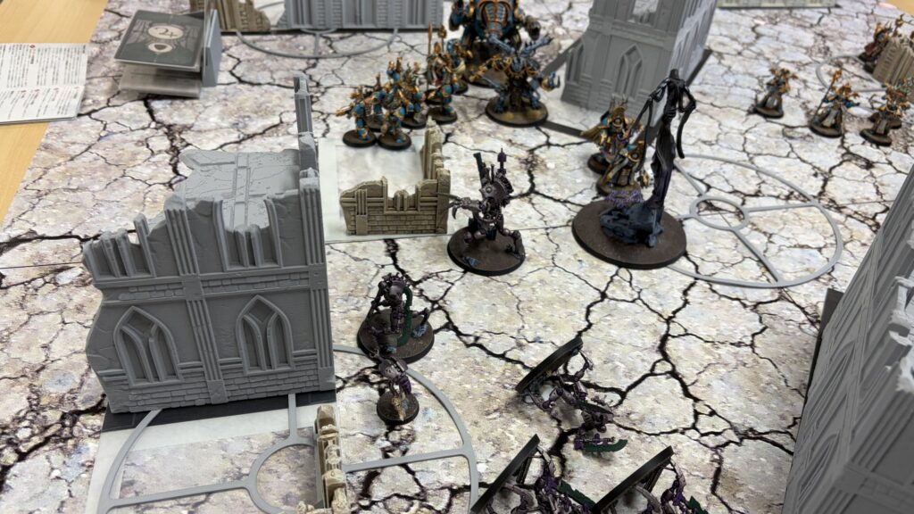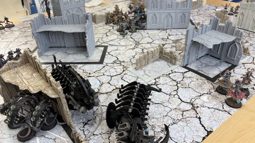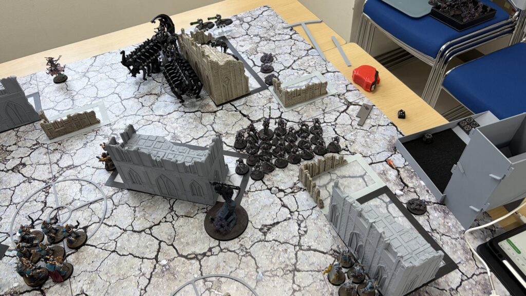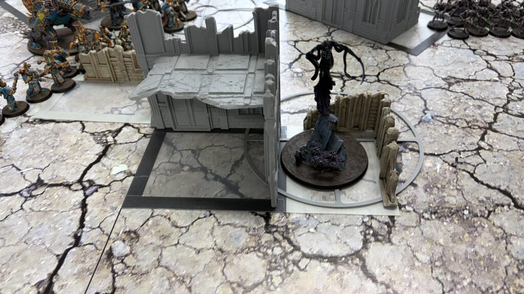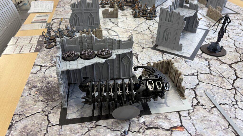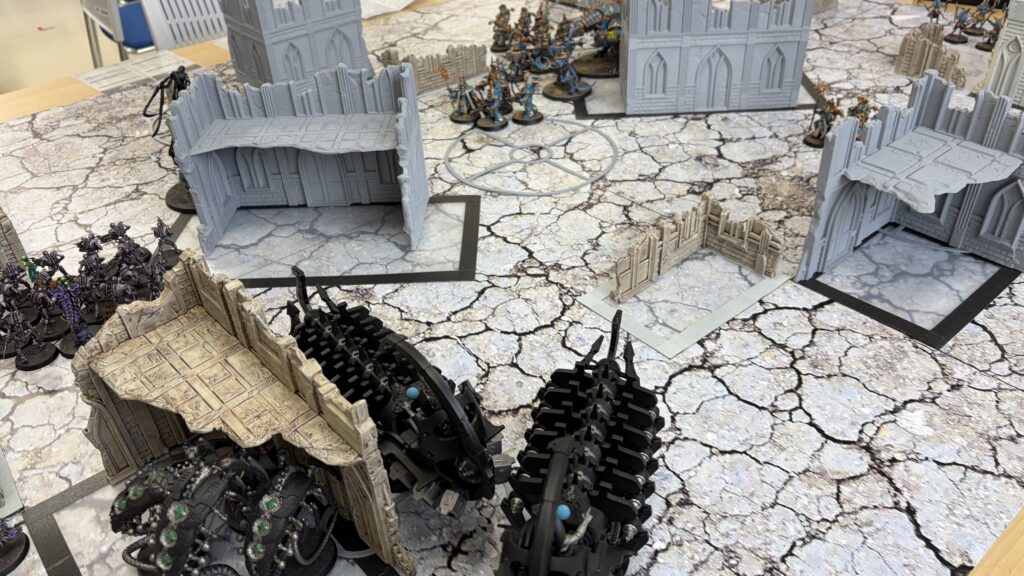 射撃では1台目のドゥームズデイアークでアナイアレイターを撃破に成功。敵の打倒を達成で勝利点2獲得。残りの2台でターミネーターを狙いましたがこれもどうせ撃つのであれば中央と右奥のマーカー内にいるルブリックマリーンを狙ってとにかくユニット数を減らすのに注力するべきでした。